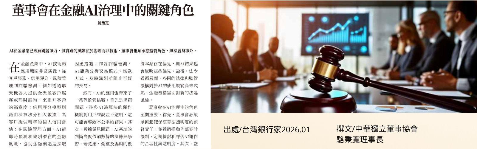 中華獨立董事協會理事長駱秉寬今天指出,人工智慧(AI)在金融業的應用全面展開,從客服、理財聊天機器人、信用評分、風險...